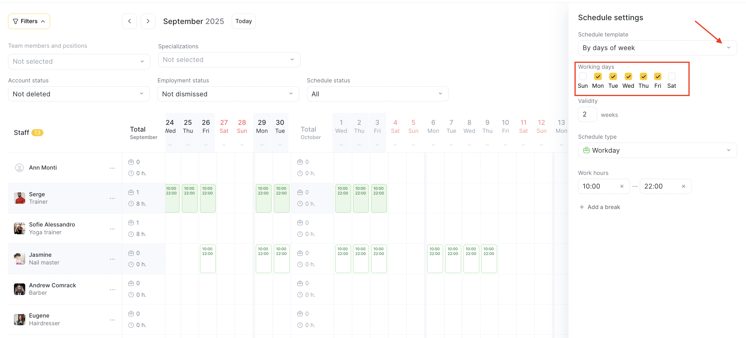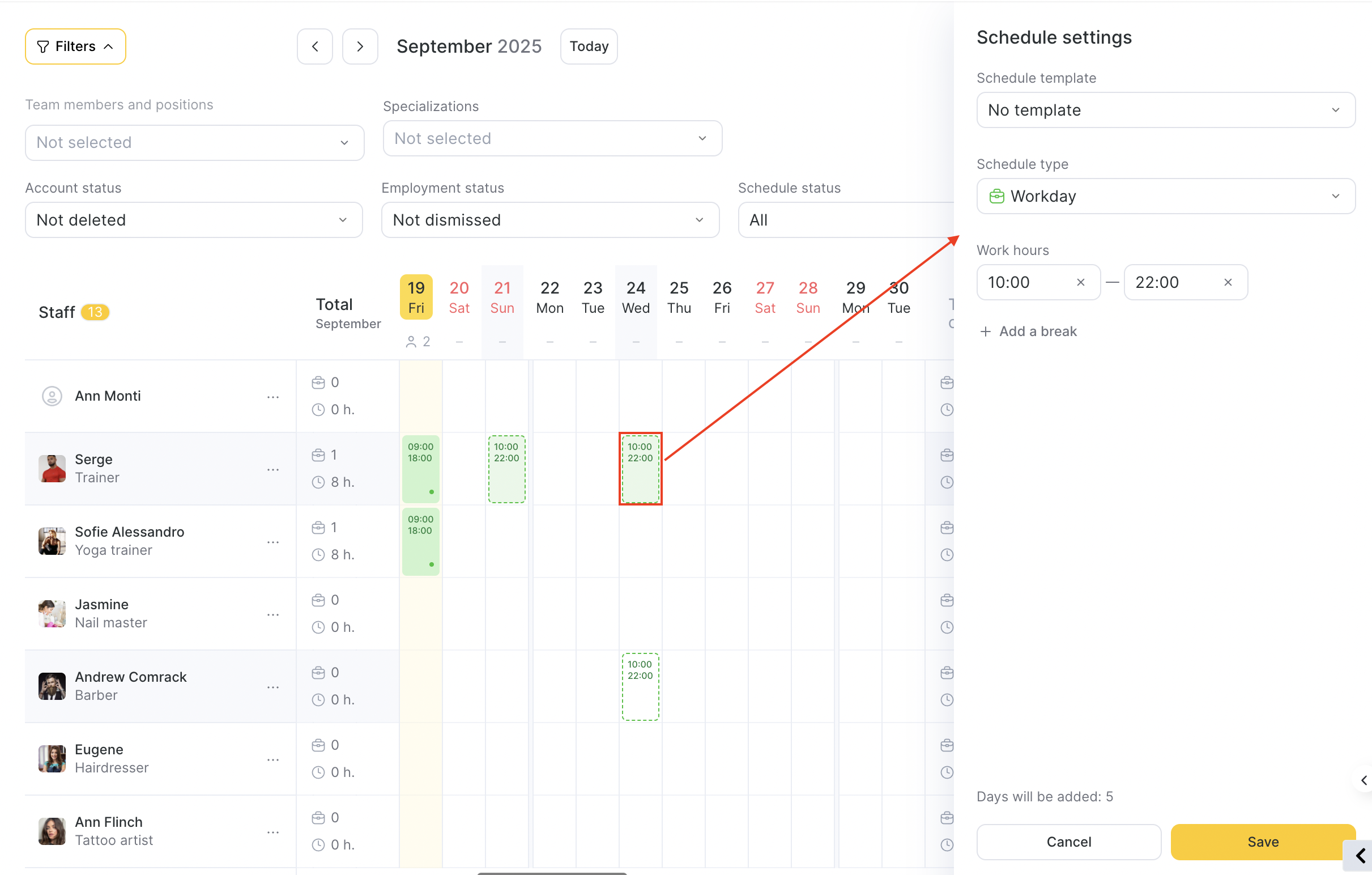 Altegio introduces an updated user-friendly interface for setting team work schedules, making the process of creating or modifying schedules for team members more efficient and streamlined with its flexible options and bulk editing capabilities.