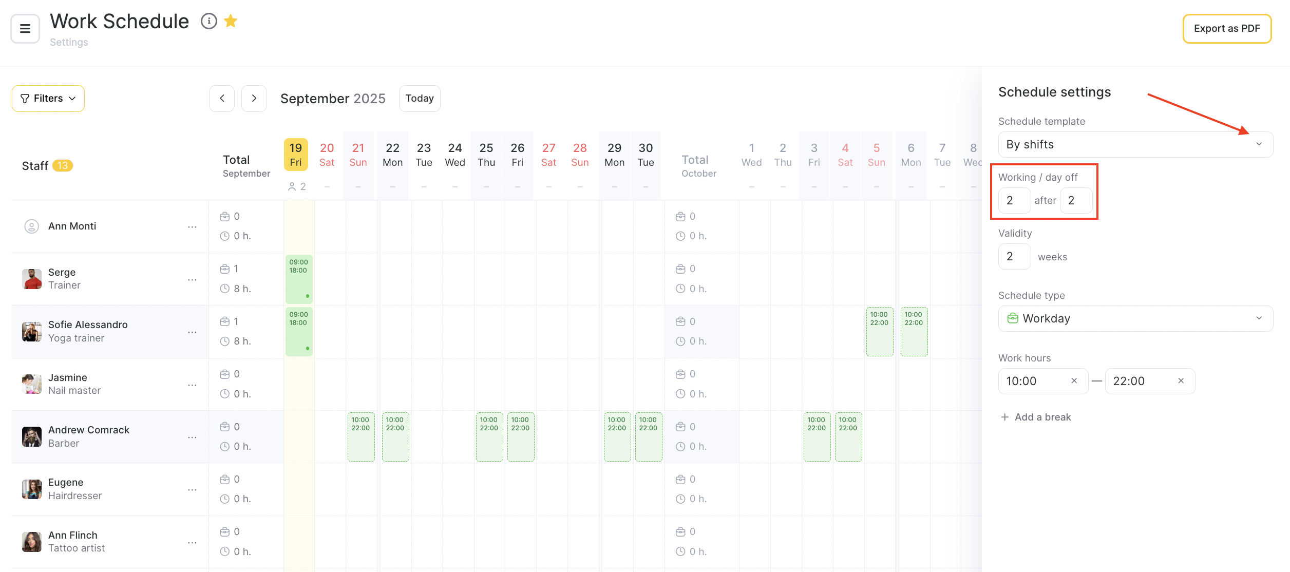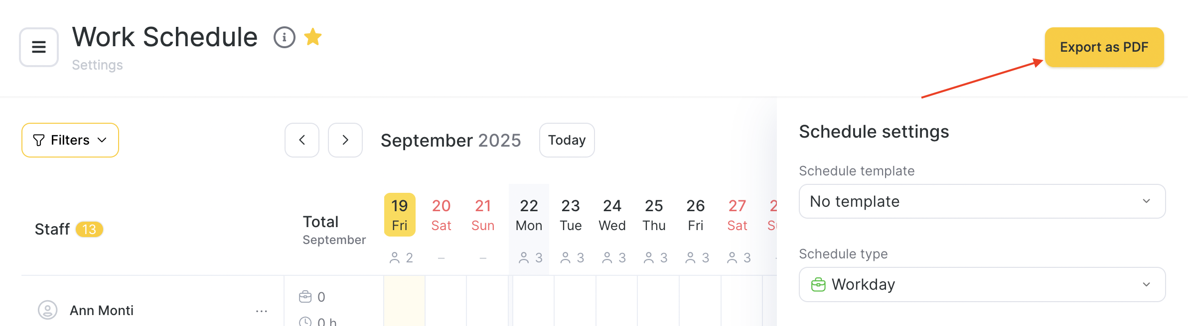 You can easily download the configured work schedule as a PDF file by clicking the “Export as PDF” button located in the upper right corner. This PDF file can then be saved to your device or printed as needed. You have the option to upload the schedule for all team members or for team members filtered by position. When uploading by position, all team members with the selected position will be included in the upload.