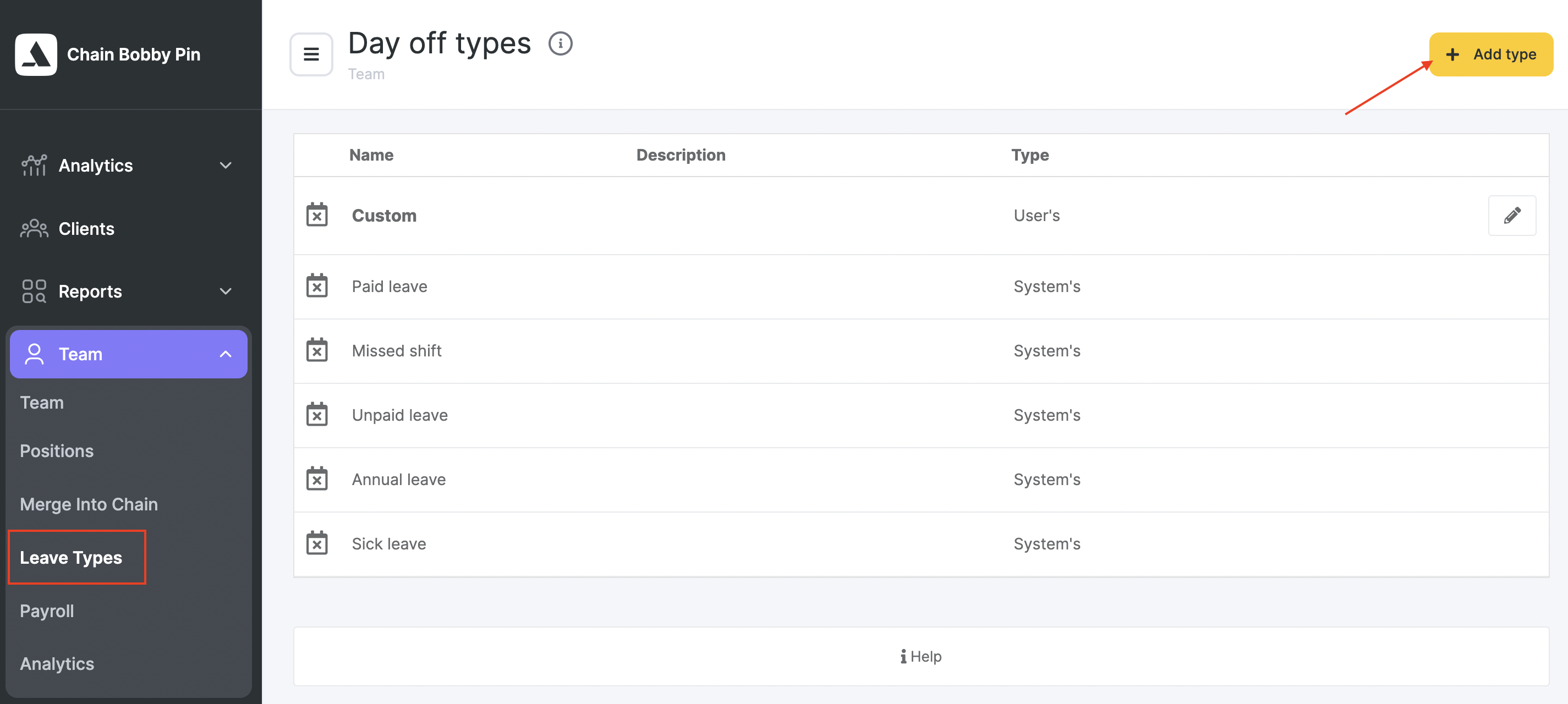 In case the default system options do not align with your needs, you have the flexibility to configure your own custom types under the “team ” > “Leave Types” section within the Chain settings.