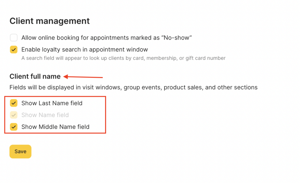 You have the option to enable the display of both fields (last name and middle name) or only one. Depending on the access rights settings, users may only see the client’s name and the first letter of their last name, or they may see the client’s full name. You can read more about setting permissions below.