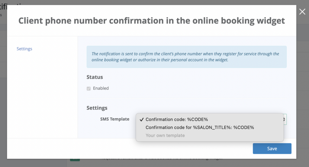 In this article, we’ll explore the process of configuring an automatic notification system that sends a confirmation code to clients via SMS. This code is used for two purposes: first, to authorize access to the client’s personal account within the online booking widget, and secondly, to confirm the client’s phone number when creating an appointment, if this option has been enabled within the online booking settings.