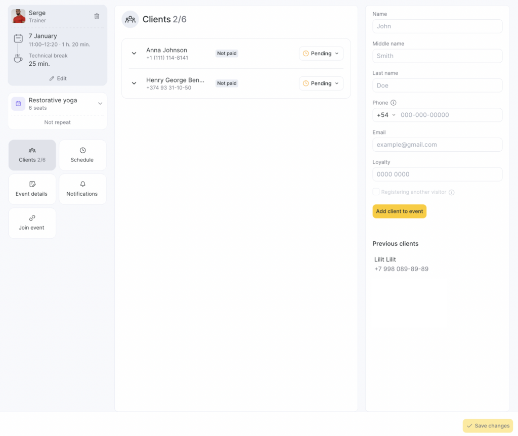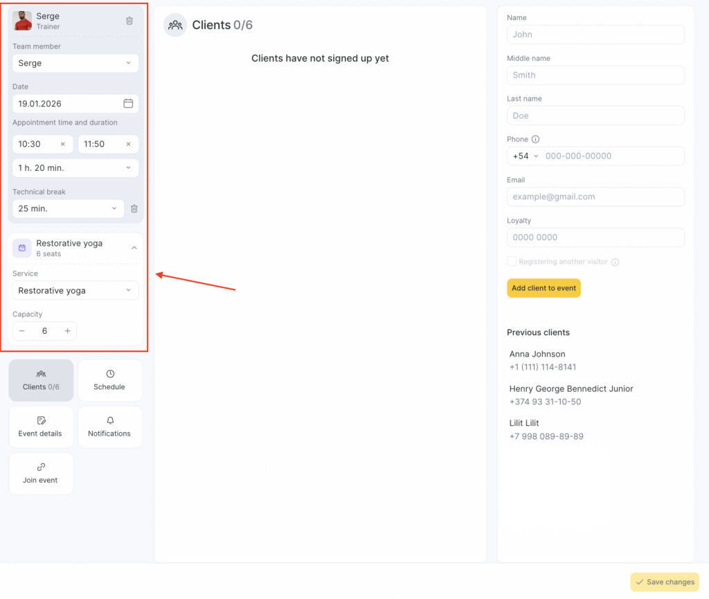 Altegio now features a new version of the group event window. Just like in the new version of the appointment window, you can now manage all key client booking tasks in the central part of the window—add products for sale, including memberships and gift cards, set individual discounts, apply loyalty, and accept payments—without switching between tabs or appointments.