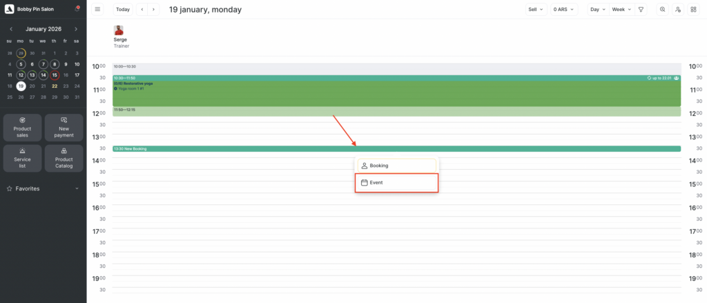 To create a new event, click on the desired date in the calendar to open the schedule for that day. Select a team member and the time for the booking. Click the New Booking button, which appears when hovering over an available time slot in the calendar.