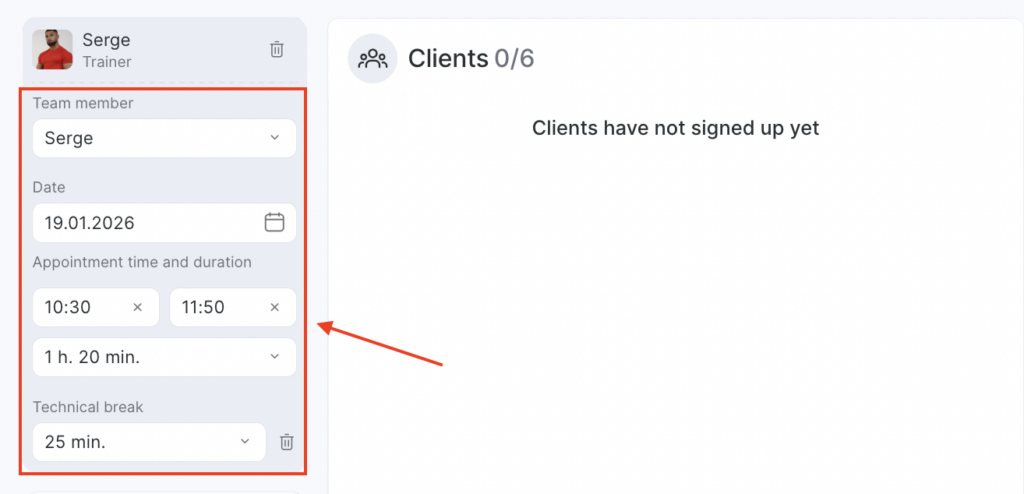 - All booked clients are shown in the central part of the event window under “Clients.” Each appointment is collapsed by default and can be expanded by clicking the arrow next to the name.