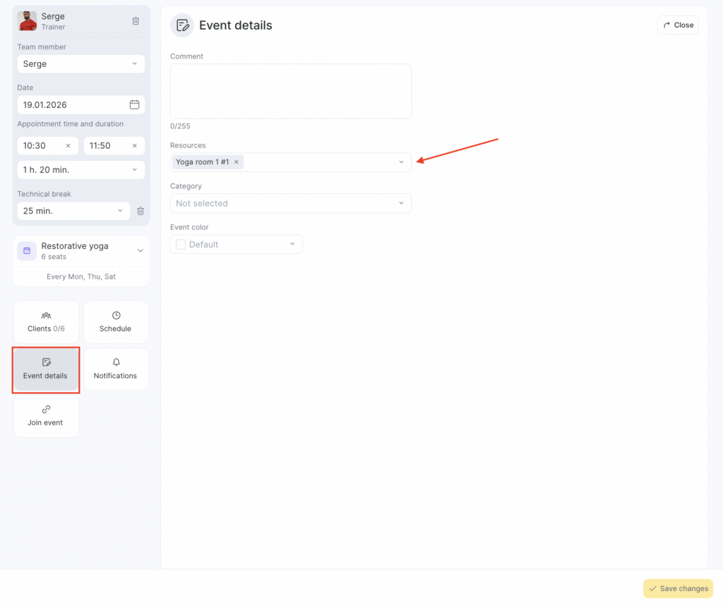 Add resources by clicking the Event details tile and select from the list. You may also select a color, event category, and add a comment.