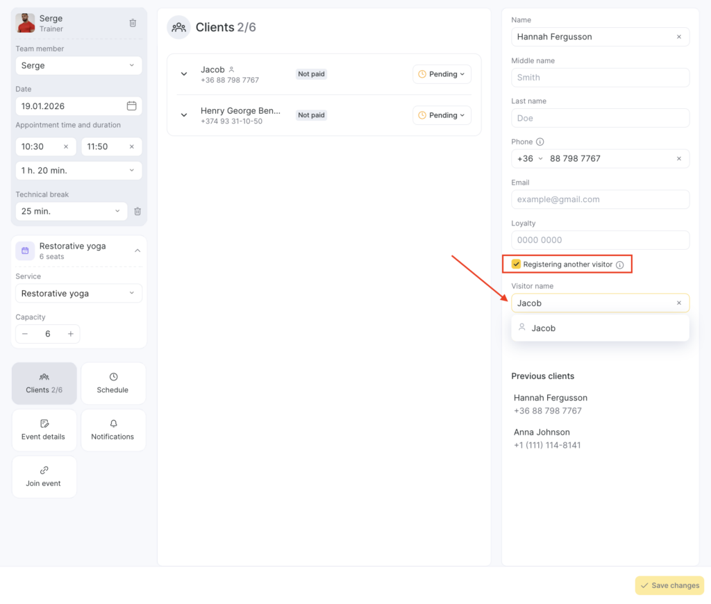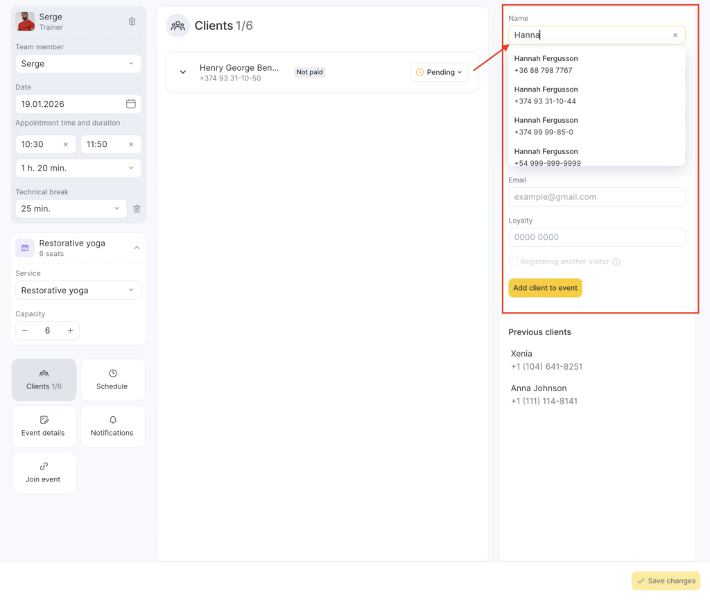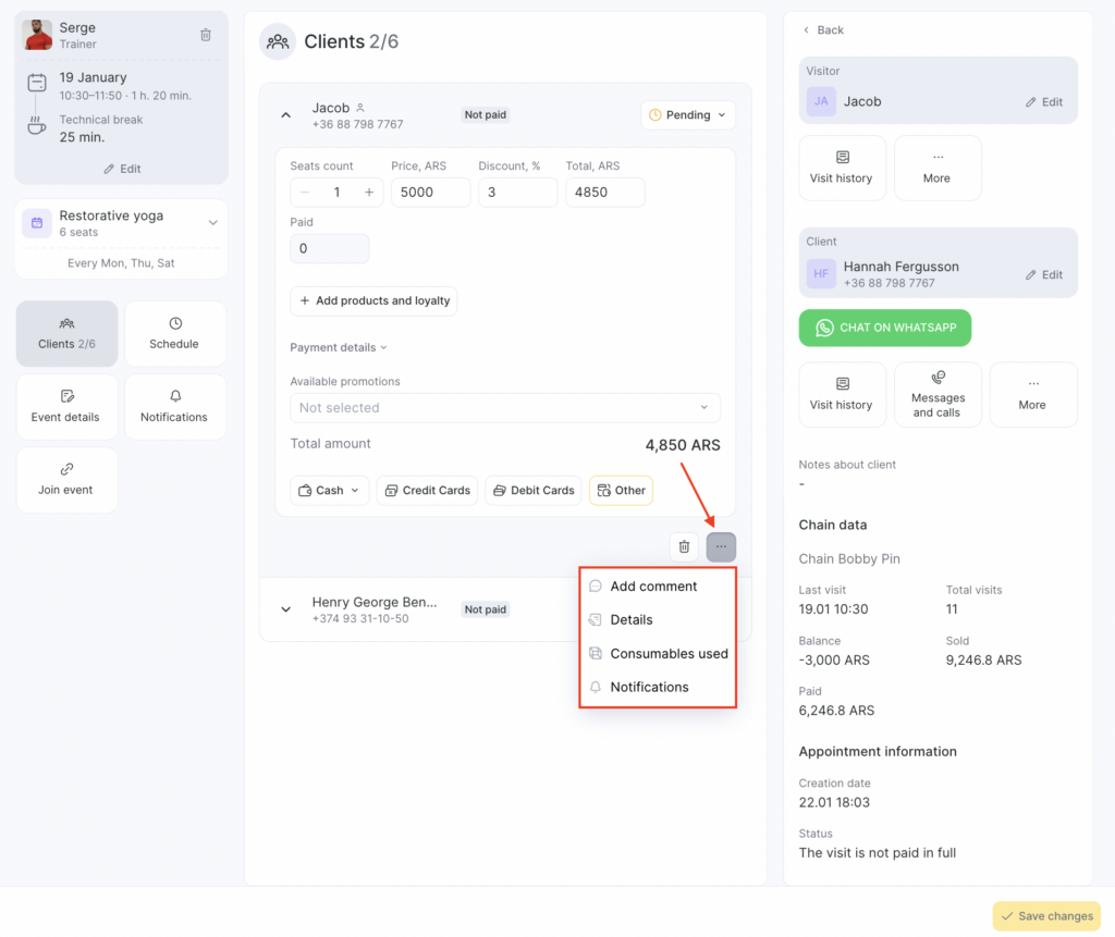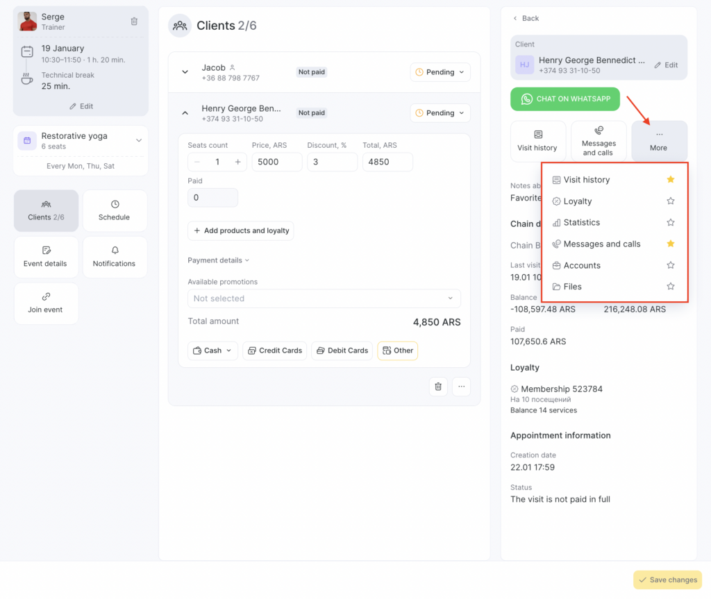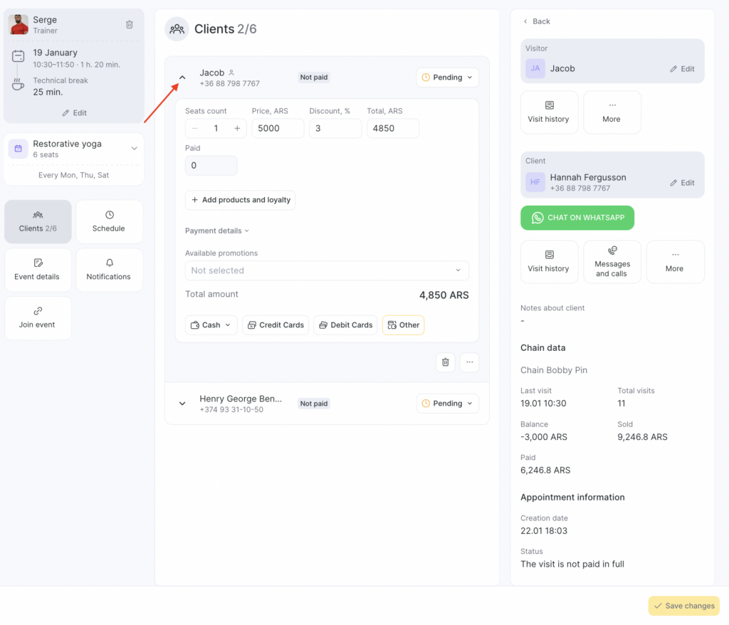 - For quick payment, expand the booking card in the “Clients” section. Add a personal discount or adjust the final price if needed.