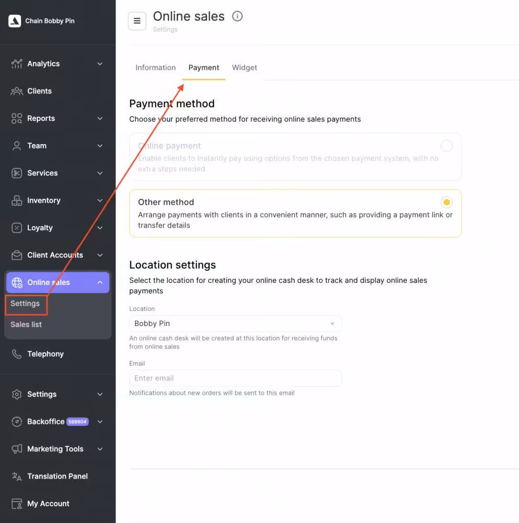 - In the chain interface, go to Online Sales > Settings and open the Payment tab.
