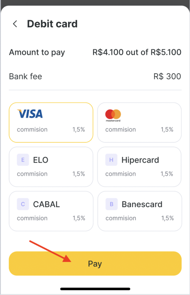 If the client opts for a Debit card, you’ll be prompted to choose the card brand (e.g., Visa, Mastercard, or whatever you have set up). The system automatically applies the set commission (e.g., 1.5%) and displays the corresponding bank fee.