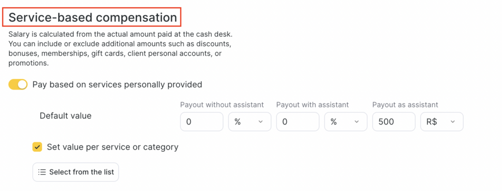 This section allows you to set how a team member is paid for services they personally performed or assisted with. The salary is calculated based on the actual amount the client paid at the cash desk. You can choose whether additional amounts (such as discounts, bonuses, memberships, gift cards, client account funds, or promotions) are included in the calculation.