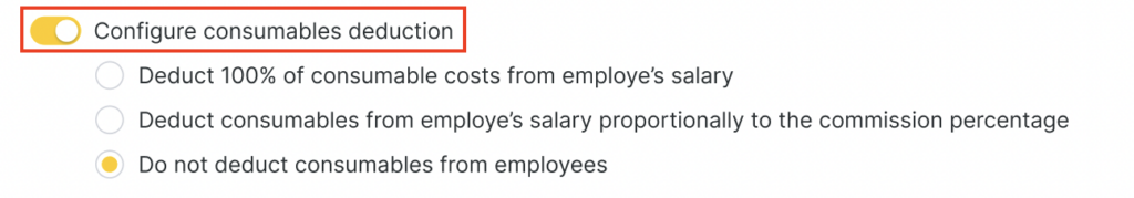 Only a part of the consumables cost is deducted. The system multiplies the total consumables cost by the team member’s commission percentage and deducts this amount from their salary. The remaining cost is covered by the company. - Do not deduct consumables from team members