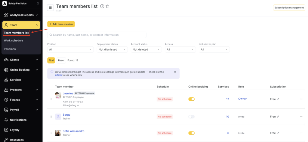The Access tab allows you to define what each team member can do inside Altegio. This is where you assign roles and permissions to team members. The access level you choose also affects whether the team member counts toward your Altegio subscription billing.