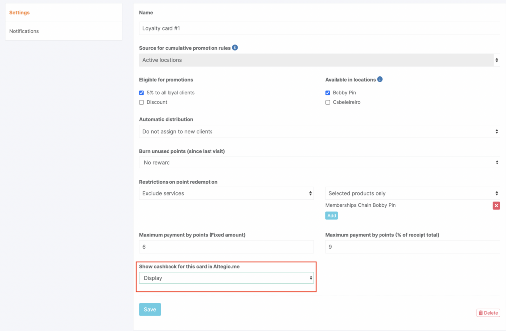 - On the opened page, at the bottom in the Display cashback for this card in Altegio.me field, select Do not display and click Save