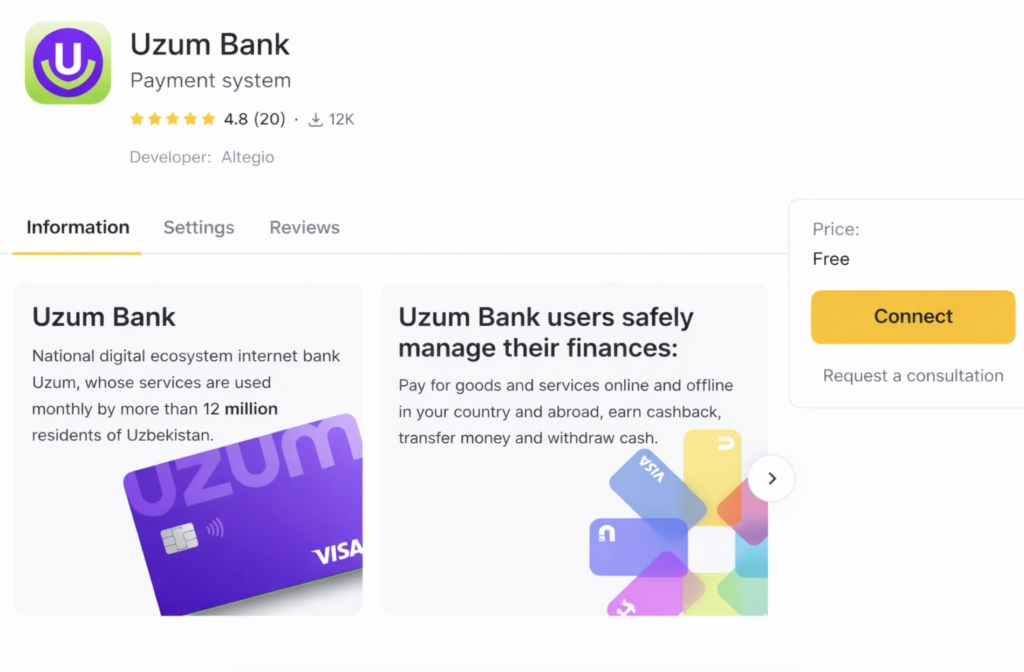 - Process installment payments or payments with Uzum Bank cards, as well as Humo, Uzcard, Visa, and MasterCard