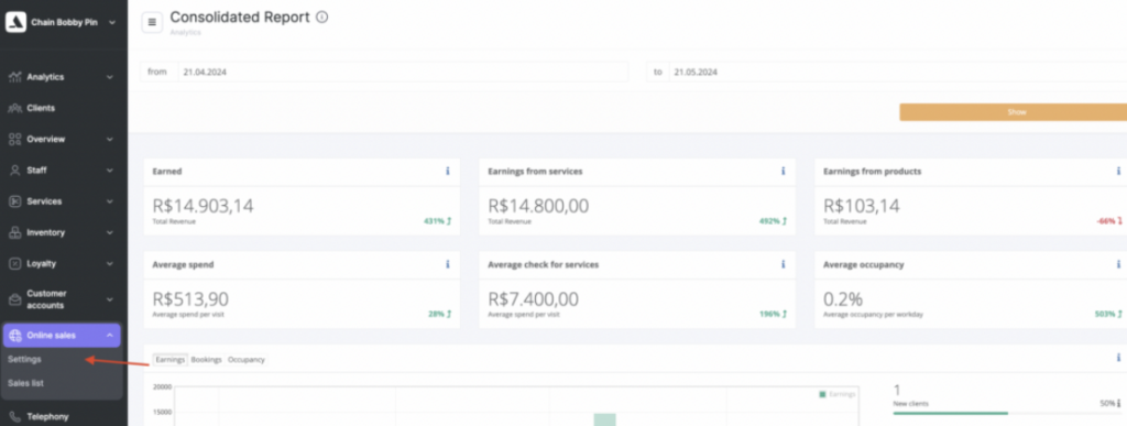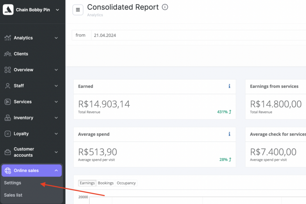 To connect the AltPay payment method to the Altegio system navigate to the chain interface, under the Online Sales section select Settings.