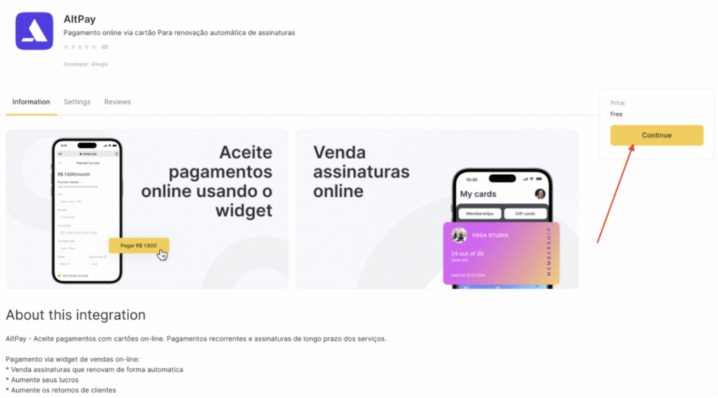 Go to location interface, Settings> Integrations. In the search field enter the AltPay keyword and click the Continue button.