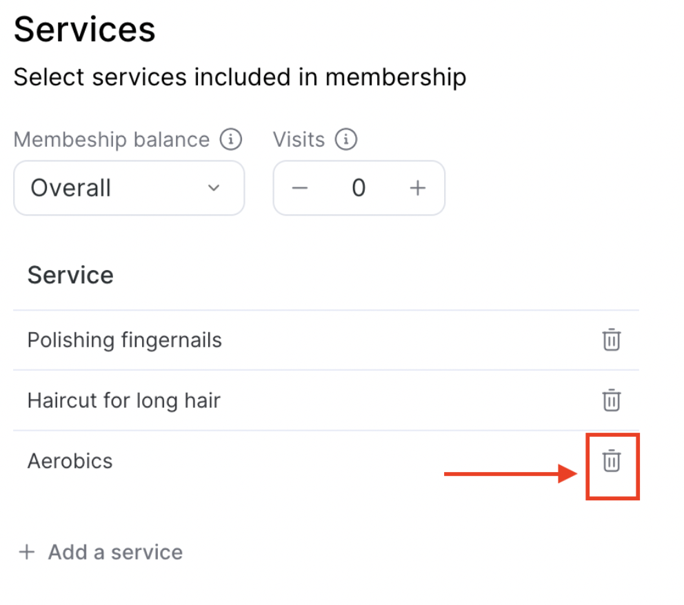 Alternatively, you can delete a service from membership by clicking on a trash can icon.