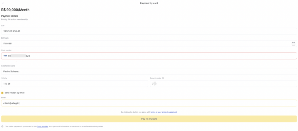 After clicking on the membership, the client will be redirected to a purchase page where they must enter their personal and payment details.