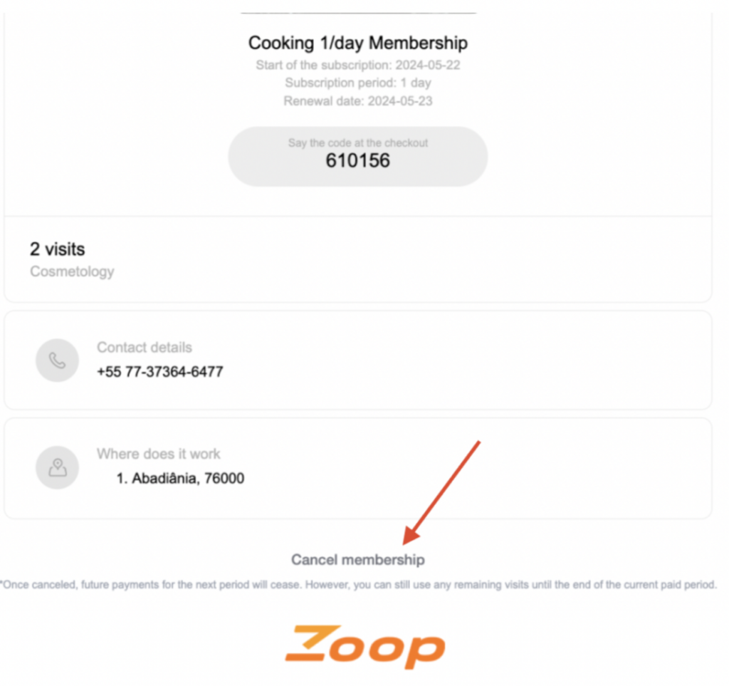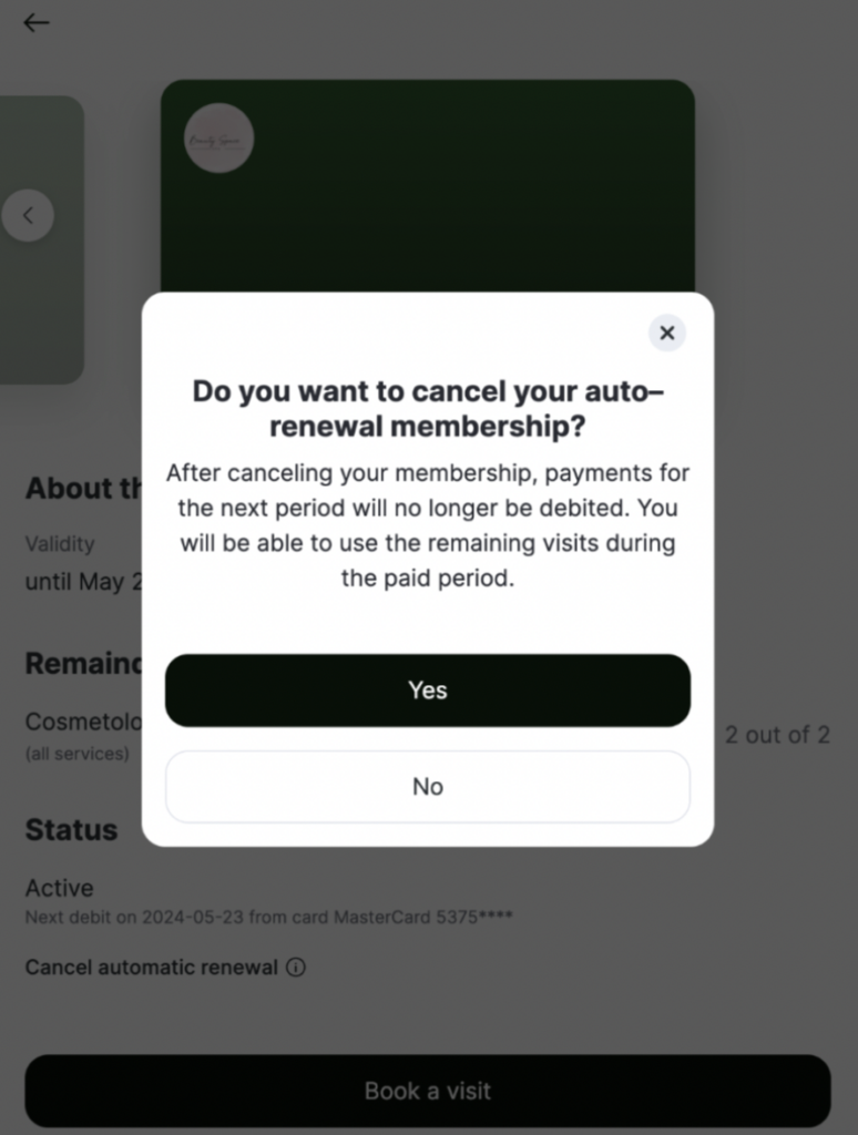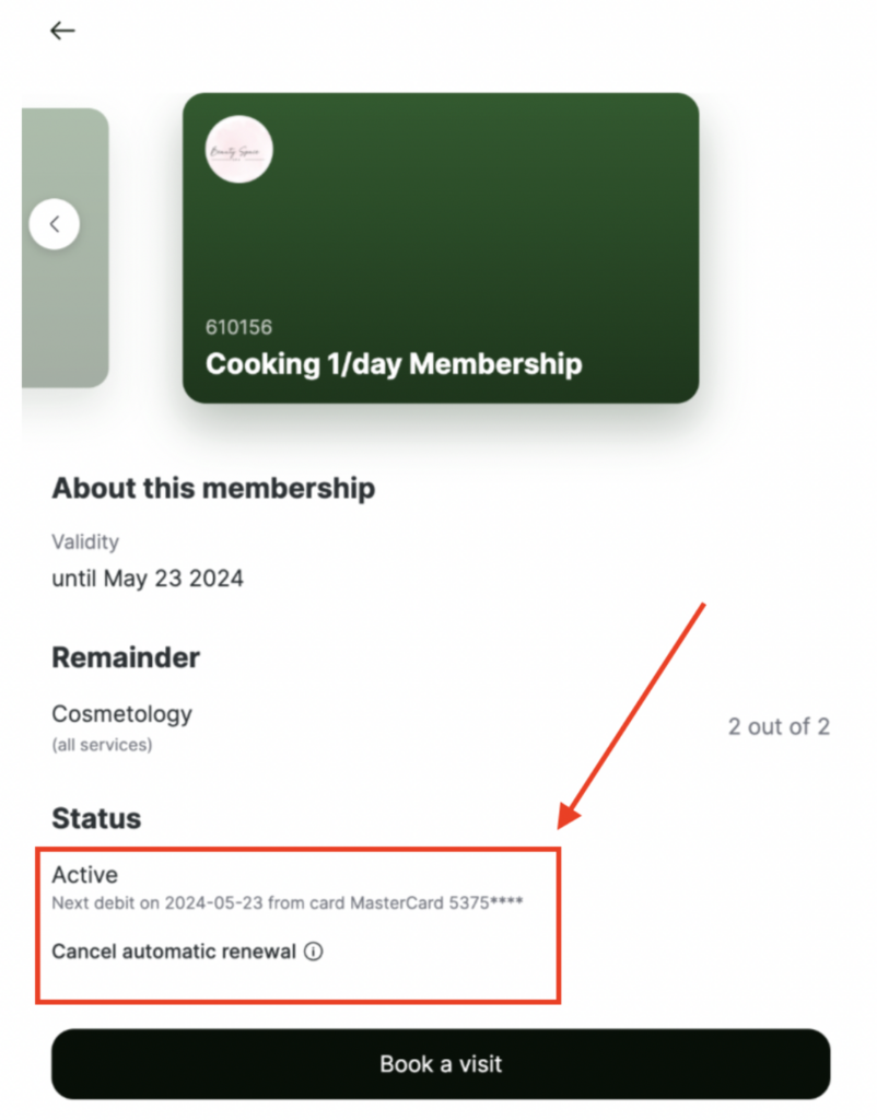 After the purchase, the membership will appear in the client’s widget, where they can see the linked card and cancel the auto-renewal if desired.