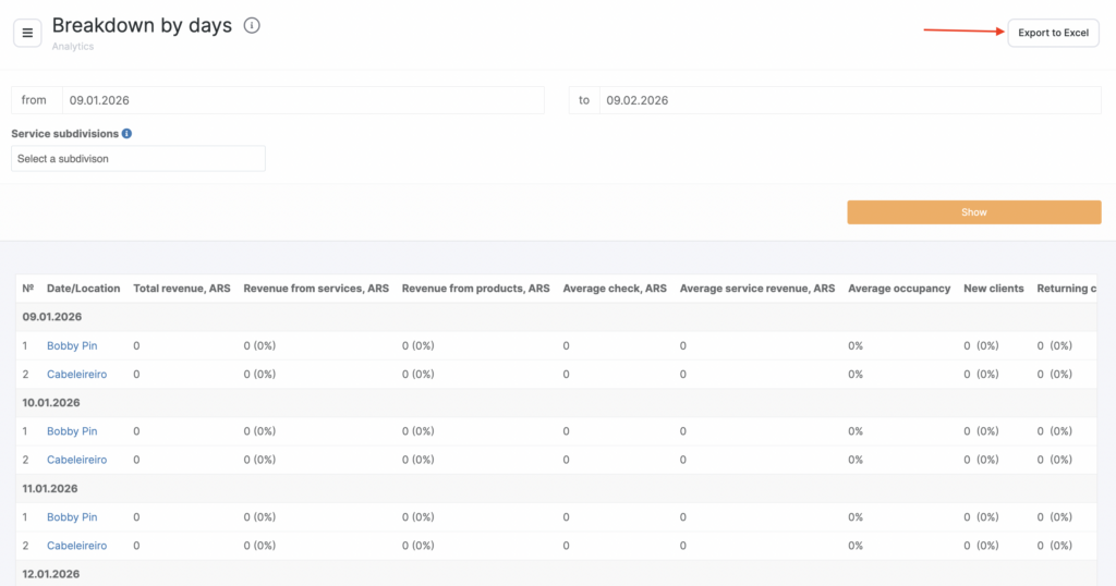 The Breakdown by Days report provides detailed performance analytics for each location, grouped by individual dates within the selected period. This report helps you track daily dynamics: revenue, occupancy, average check, and client activity for every location on a day-by-day basis.