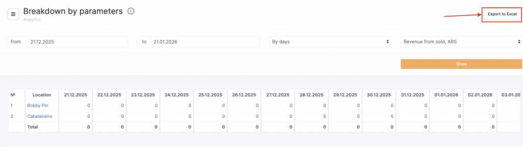 You choose one parameter (e.g., revenue from sold, average spend, new clients, cancelled appointments), and the system builds a table showing how this value changed across dates and locations.