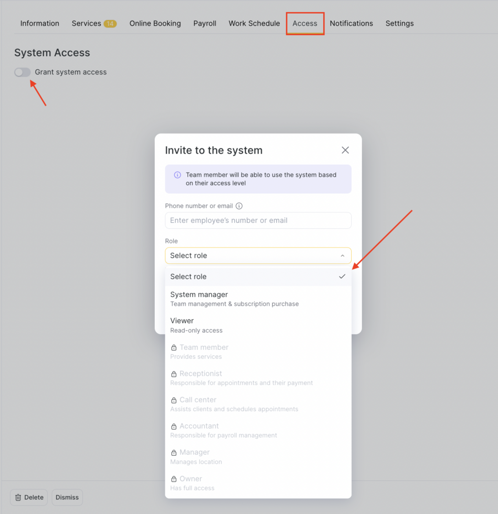 Then enable Altegio access if they should be able to log in (their actual access will depend on the permissions you assign). Enter the phone number or email address where the team member will receive the invitation, and set the role.