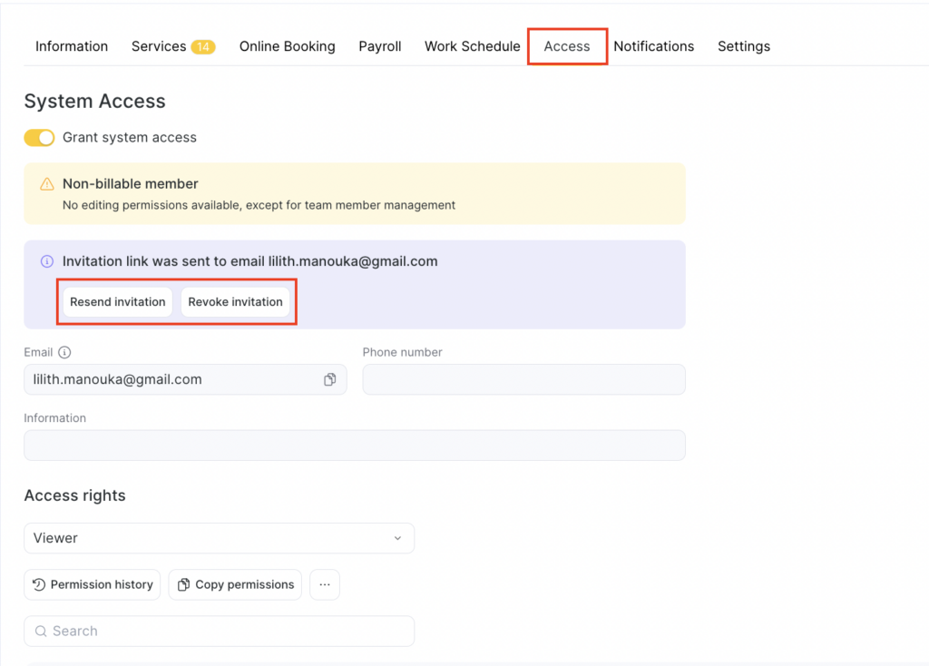 - In the team member profile, go to the Access tab.