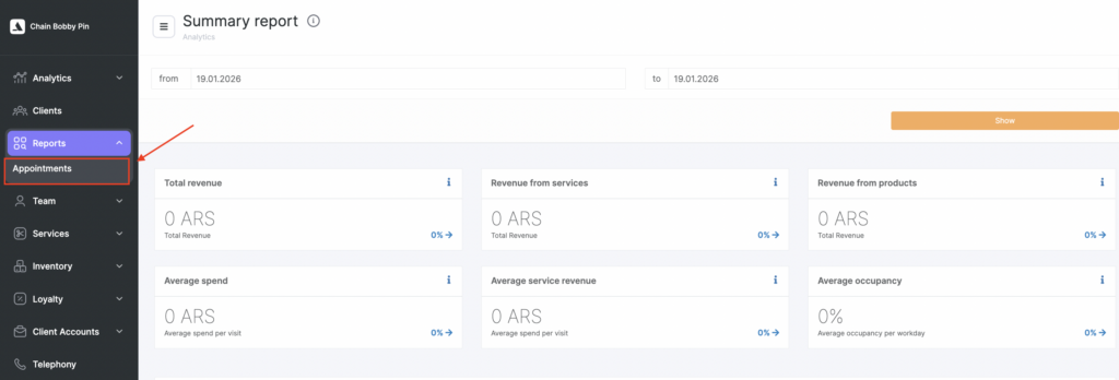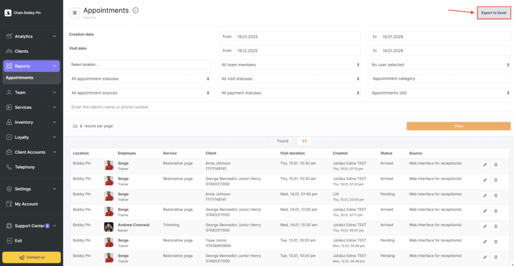 The Reports > Appointments section lets you view, filter, and manage all appointments created across the chain for the selected period. It shows data for the location, team member, service, client, visit time, statuses, appointment sources, and the appointment creator.