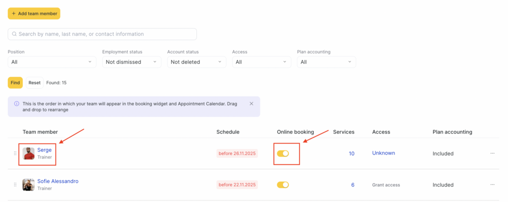 Go to Settings > Main settings > Team. On the team member list page, you can quickly enable or disable online booking for a team member without opening their settings.