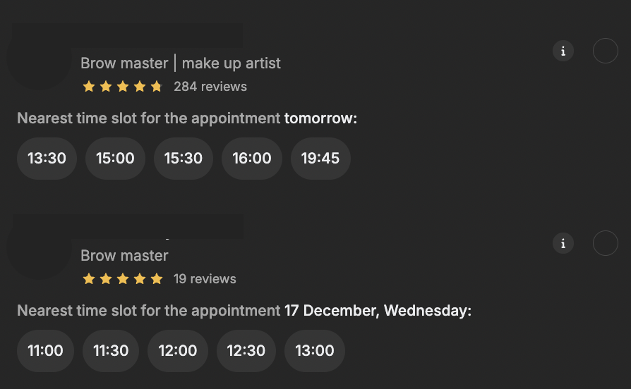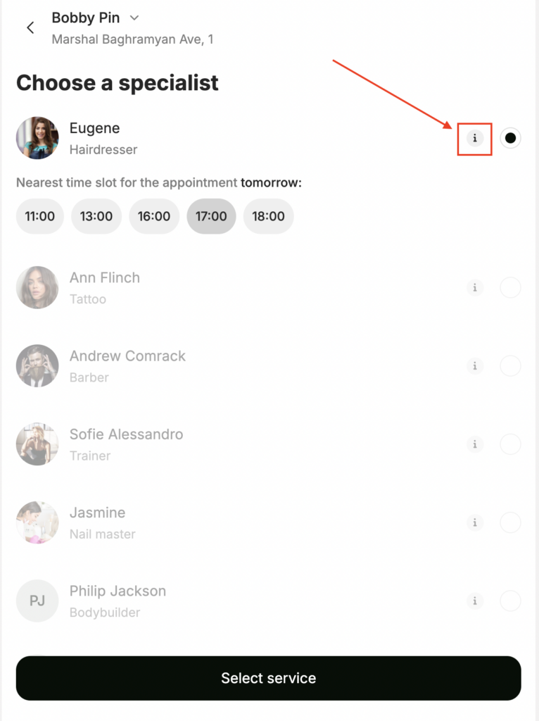 The description opens in the online booking widget when the user clicks the i icon next to the photo. This section usually includes professional experience, education, list of services, specialization, and brief personal details.