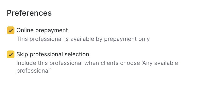 The Any available professional option is displayed in the online booking widget. Allow or forbid online booking with this team member if the client selected the Any available professional option.