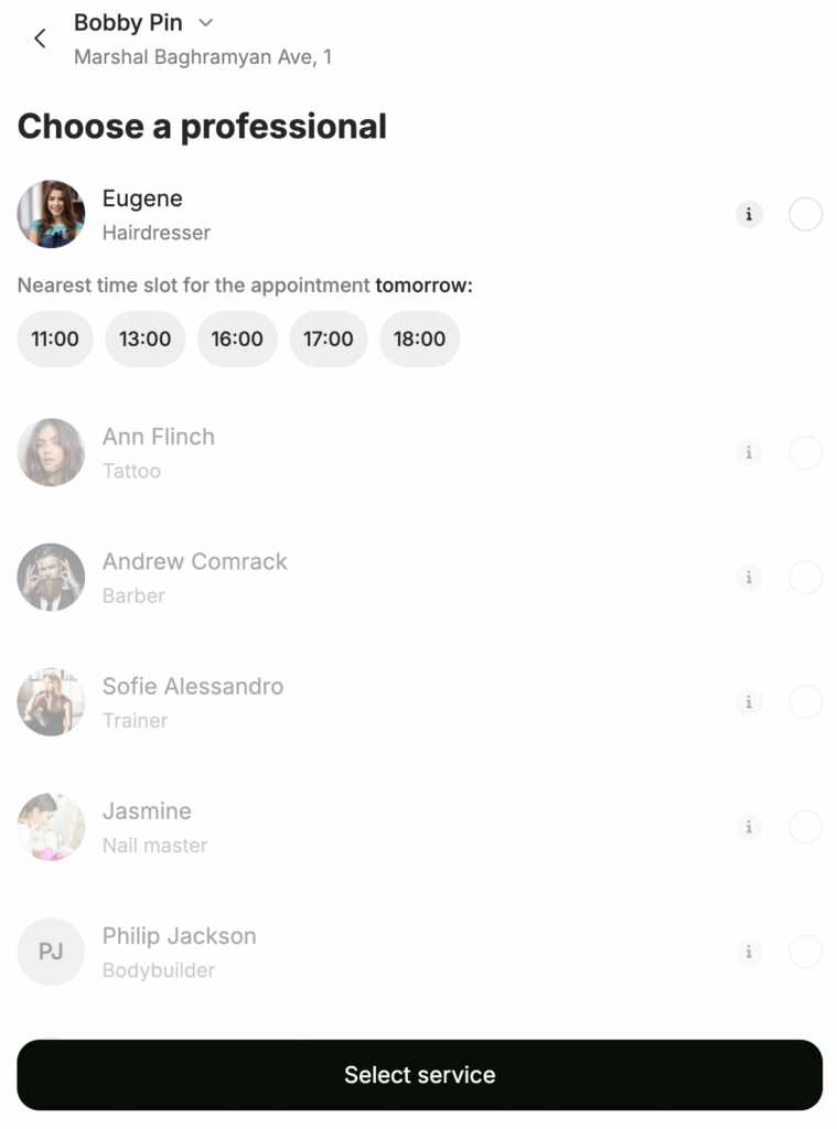 The same mode can be enabled when configuring the booking steps in a separate widget (by setting Any available professional in the Preselected team member field — read more about these settings in the article).