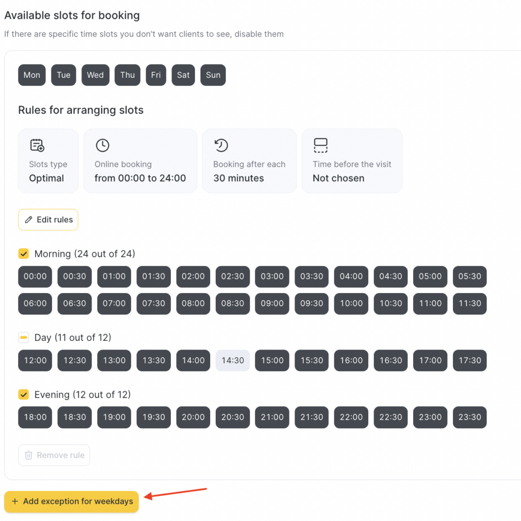 Edit the availability of slots for morning/day/evening if necessary. This setting is available only for the fixed and optimal slot types with the From online booking time option. To do this, click the required slots: