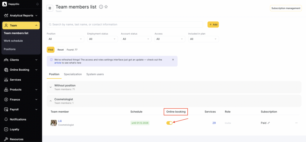 - Go to Team > Team members list (Administration mode). On the team member list page, you can quickly enable or disable online booking for a team member without opening their settings. To go to the detailed online booking settings, click on the team member’s name.