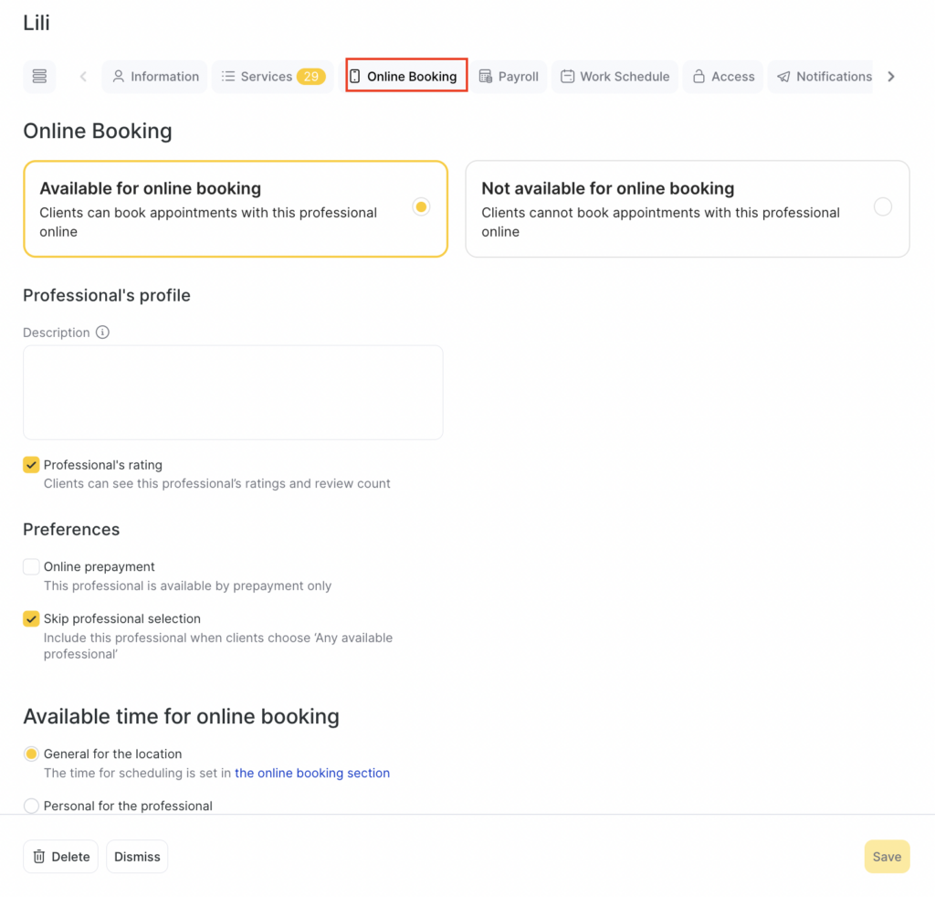 After assigning services to a team member, set up online booking for them. You can configure availability for online booking, description, rating display, online prepayment, skipping team member selection, and available time for bookings.
