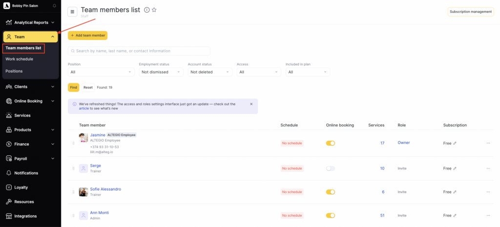 - Go to the Team > Team members list section (Administration mode).