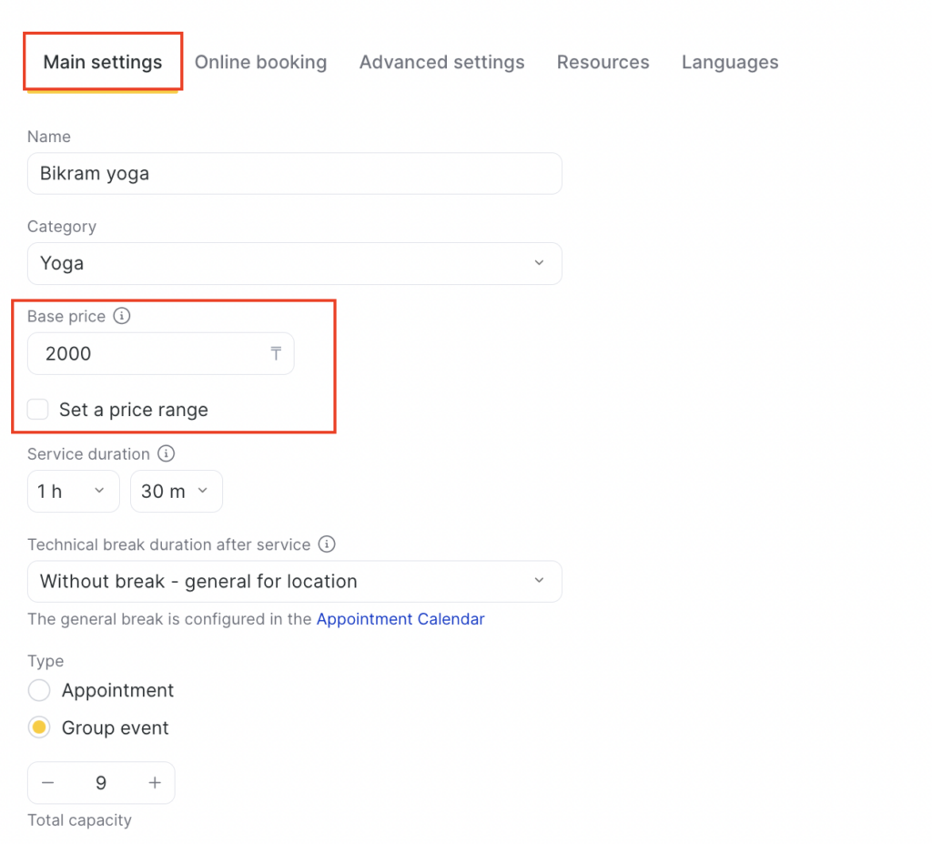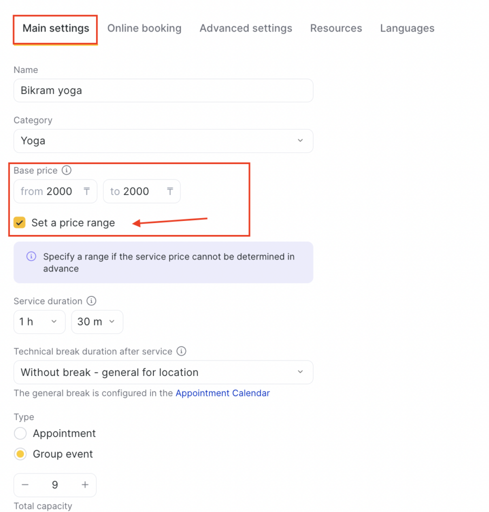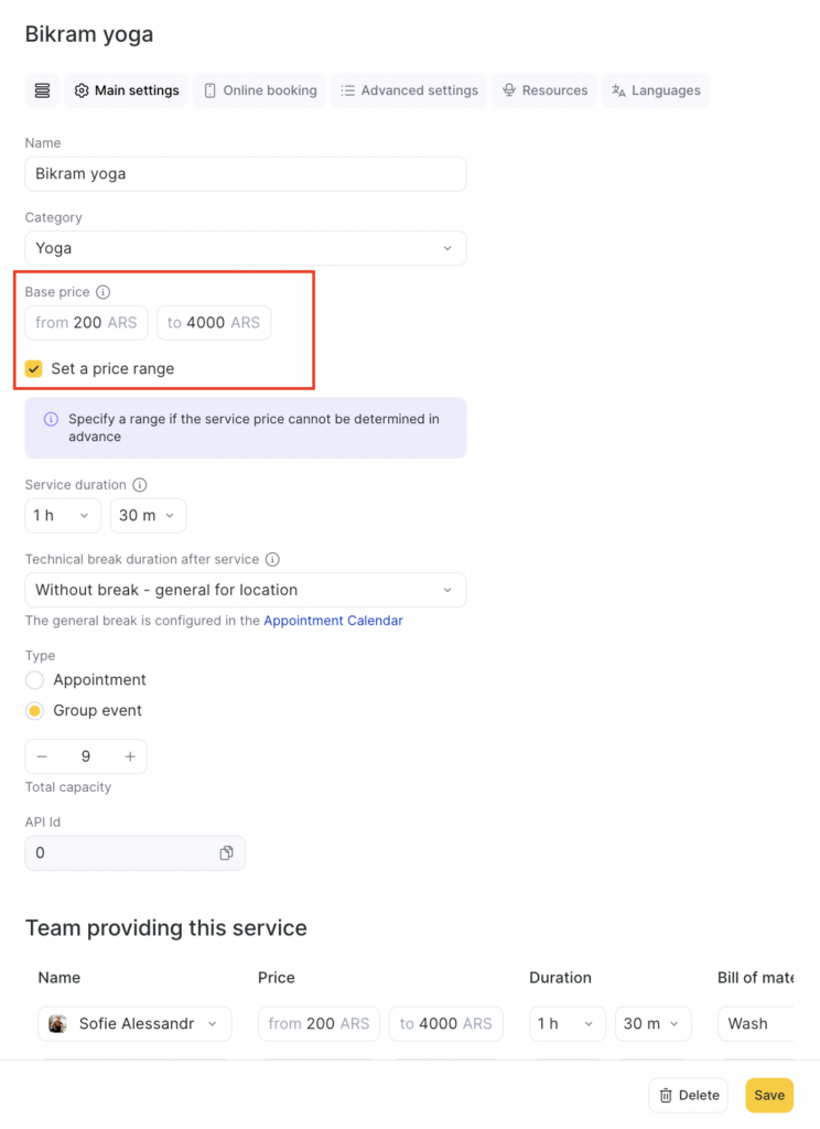In the Base price field, it is better to specify the price that is most commonly used for this service among team members. This price will be applied to all team members assigned to the service who do not have individual prices set. You can also specify a base range price; for more details, see the section Setting range prices later in this article.