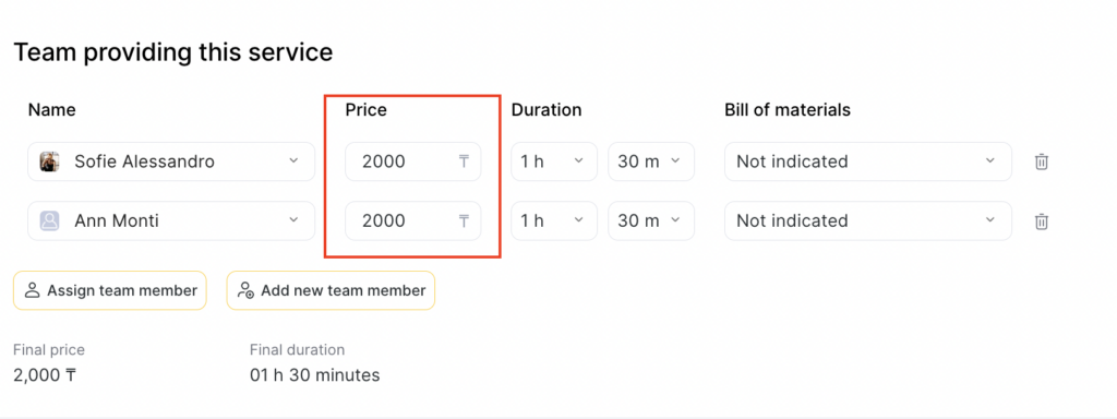 - In the Price column, specify the individual service price for each team member according to their price list.