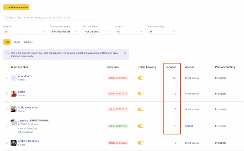 Altegio now allows you to set service prices per team member. With this new setting, you can assign different individual prices for different professionals for the same service. This helps reduce the number of services and avoid creating separate identical services for professionals with different prices.