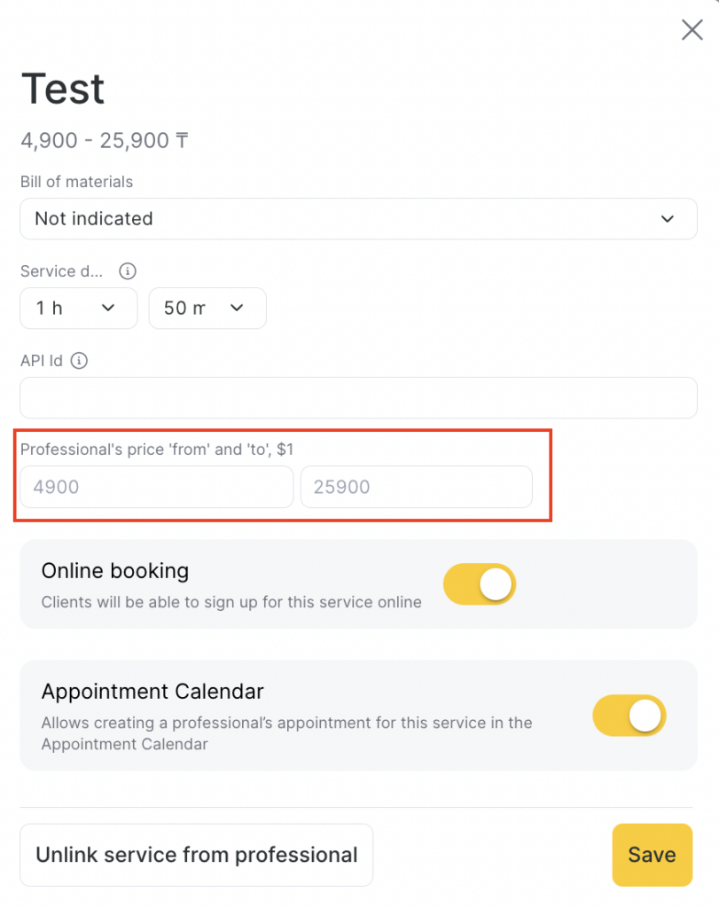 If a default range price is set in the service settings, then the price in the team member settings will also be displayed as a range. In this case, if you need to specify a fixed amount, set the same price in both the from and to fields.