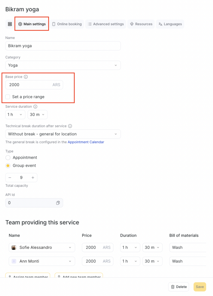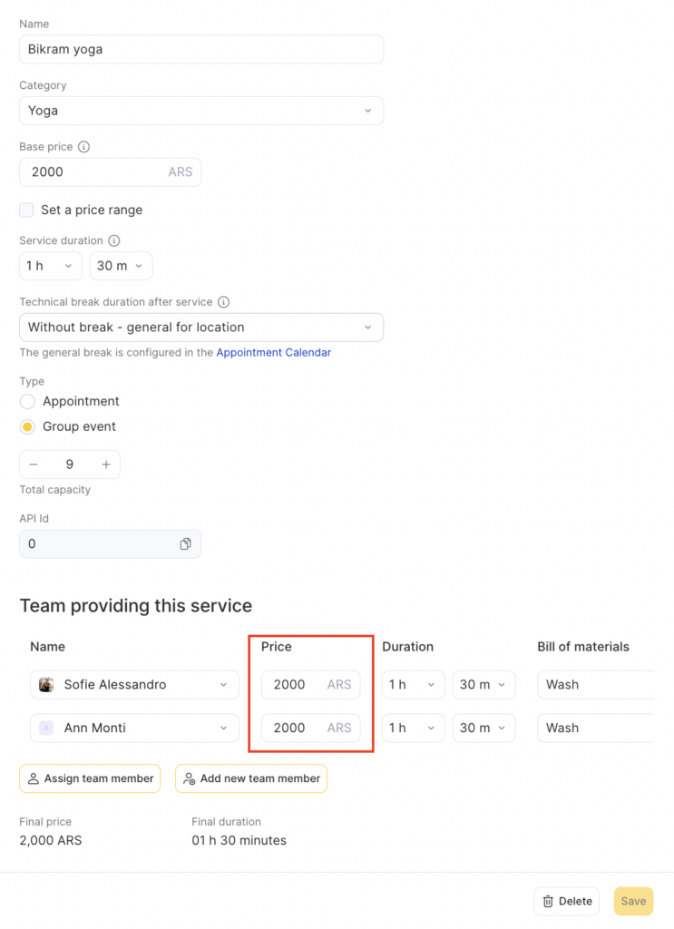 If you do not want to set different prices per team member, you can leave the “Price” field unchanged — in this case, the base service price will be used there.If you have already set different prices per team member but want to revert to the previous behavior and have a single price for all team members, delete the previously entered prices from the “Price” field for all team members assigned to the service. After deletion, the value from the “Base price” field will be used, and the service price will be controlled from that field.