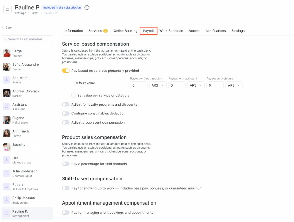 In this article, we’ll cover how to set up payroll accrual rules for an receptionist: for product sales, the number of created appointments, and additional bonuses based on daily turnover or profit.