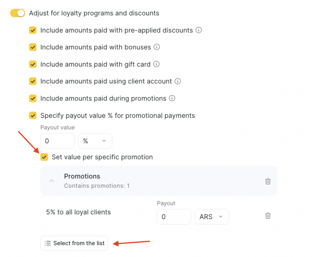 You can also set separate payouts for each promotion in the list. To do this, check Set value for a specific promotion, click Select from the list, choose the promotion, and set a percentage of the actual amount or a fixed amount.