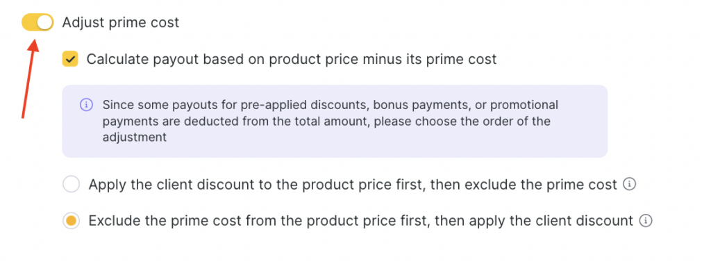 The system also allows you to choose the order of application. To do this, enable Calculate payout as the difference between the product price and its prime cost and select the order: