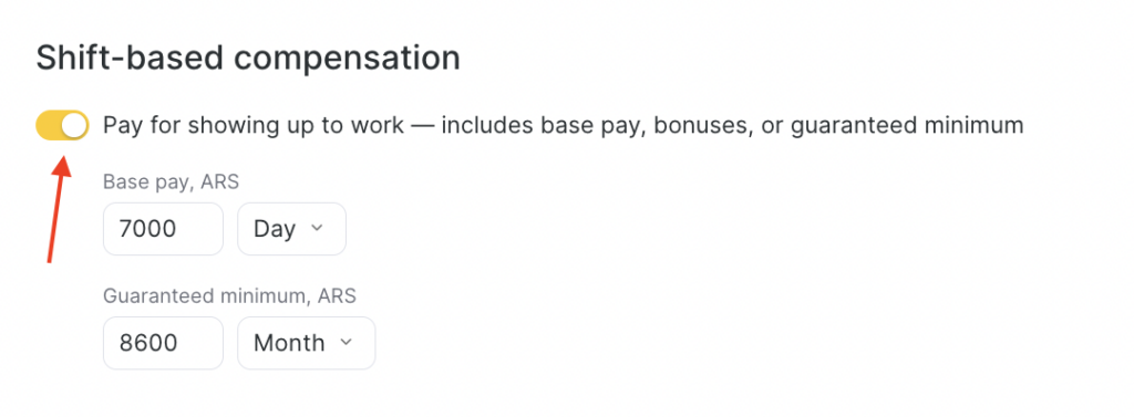 - Set a guaranteed minimum per day/month — the amount the team member will receive in any case, even if the base salary plus percentages is less than the minimum. Useful during low-load periods.