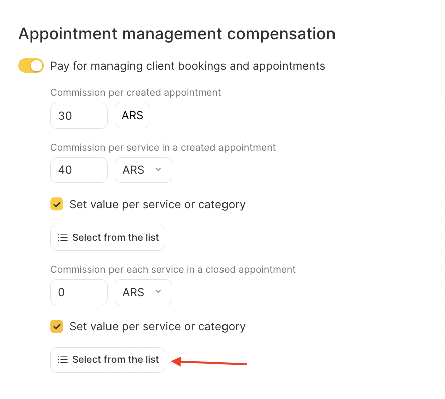 Set individual values for different services or categories. To select categories or services, click Select from the list.