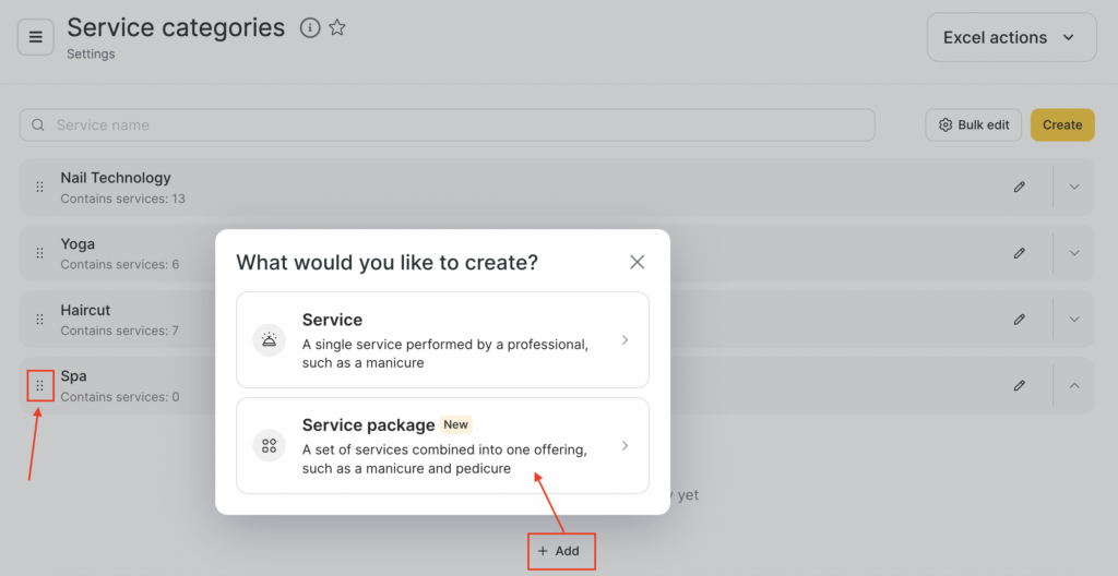 - Adding an additional service to a package booking that is not part of the package depends on the order of actions. You can first create a booking with a service and then add a package to it, or you can add a service to any existing package booking.