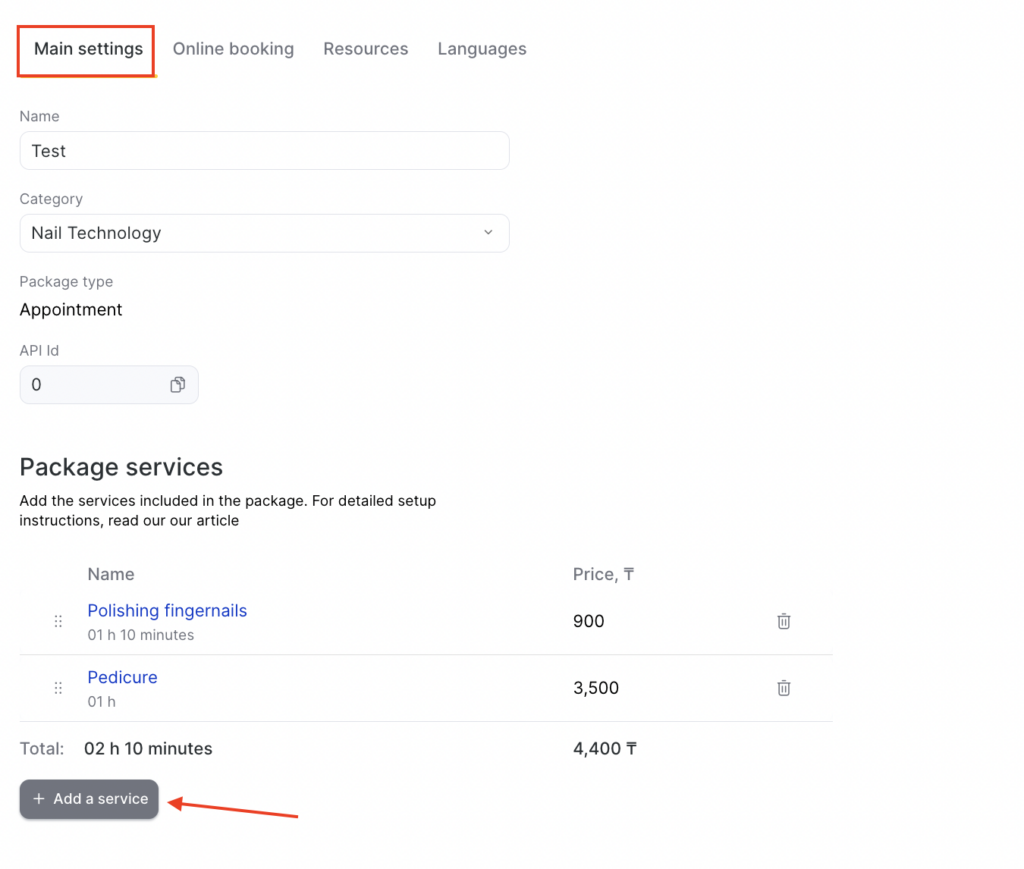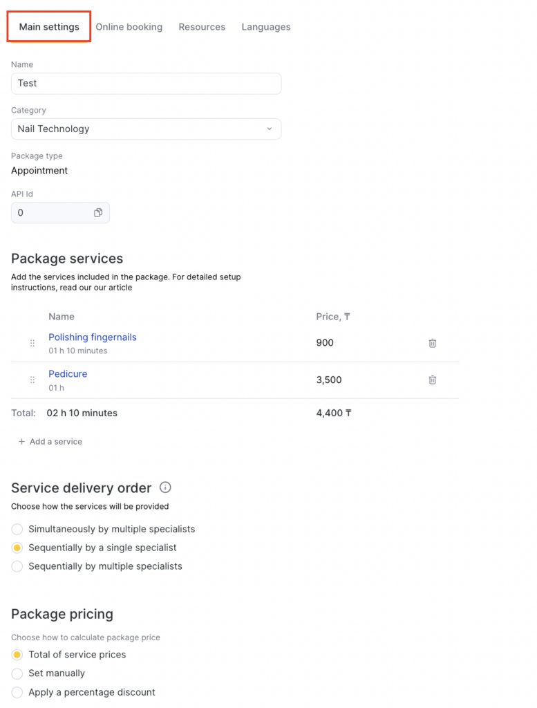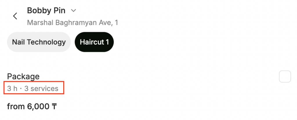 - If services are configured with a duration of zero, the package duration will be zero. At the same time, if only some services have a non-zero duration, only those durations will be taken into account. For example, one service has a duration of 0, another 2 hours, and another 1 hour — the package duration will be 3 hours.