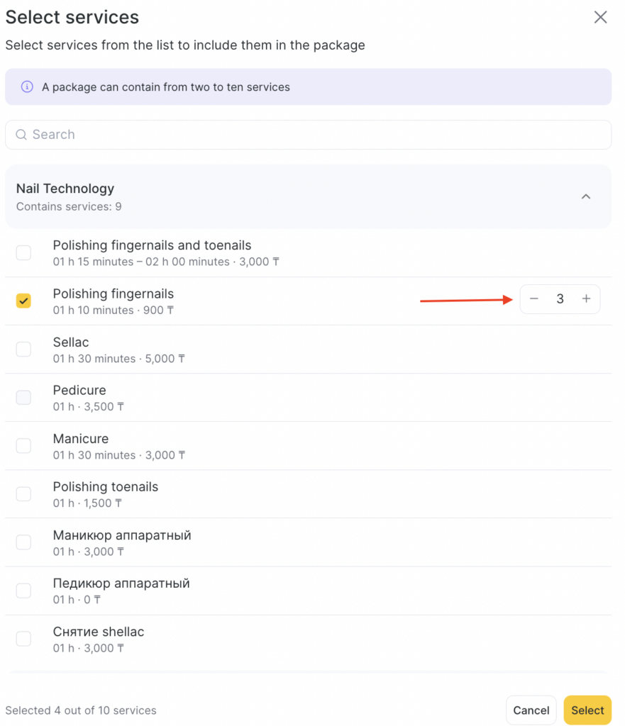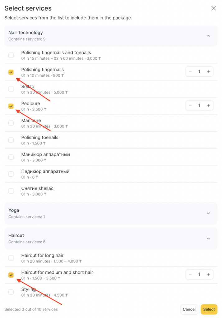 - In the modal window that opens, select the services that will be included in the package. Expand the required category and select the service. You can also use the search. After all services are selected, click Select.