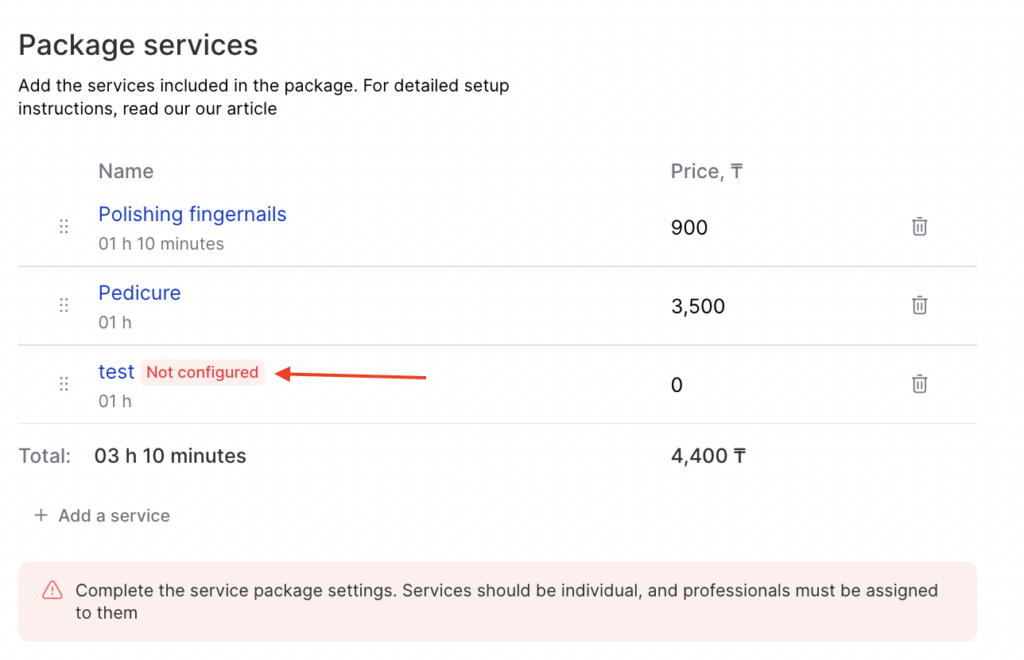 If a service is not linked to a team member, the note Not configured will appear next to its name. If such a service is added to a package, you will see a corresponding warning. It will not be possible to fully configure a package that contains such a service.