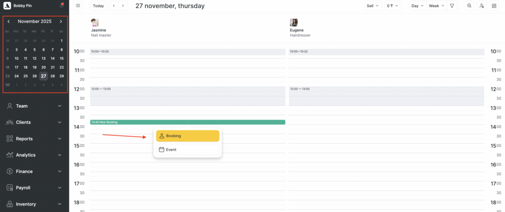 - Click the required date in the calendar on the left; the Appointment Calendar for that day will open. Choose any team member who provides the package service and select the time you want to book the client for.